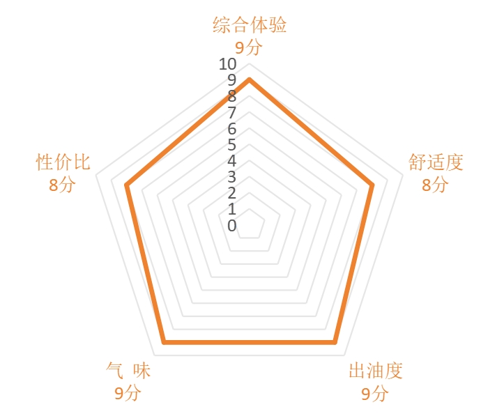 备注:雷达图越大产品评价越高,其中软硬度越高越软;出油度越高出油越少;气味越高异味越少。