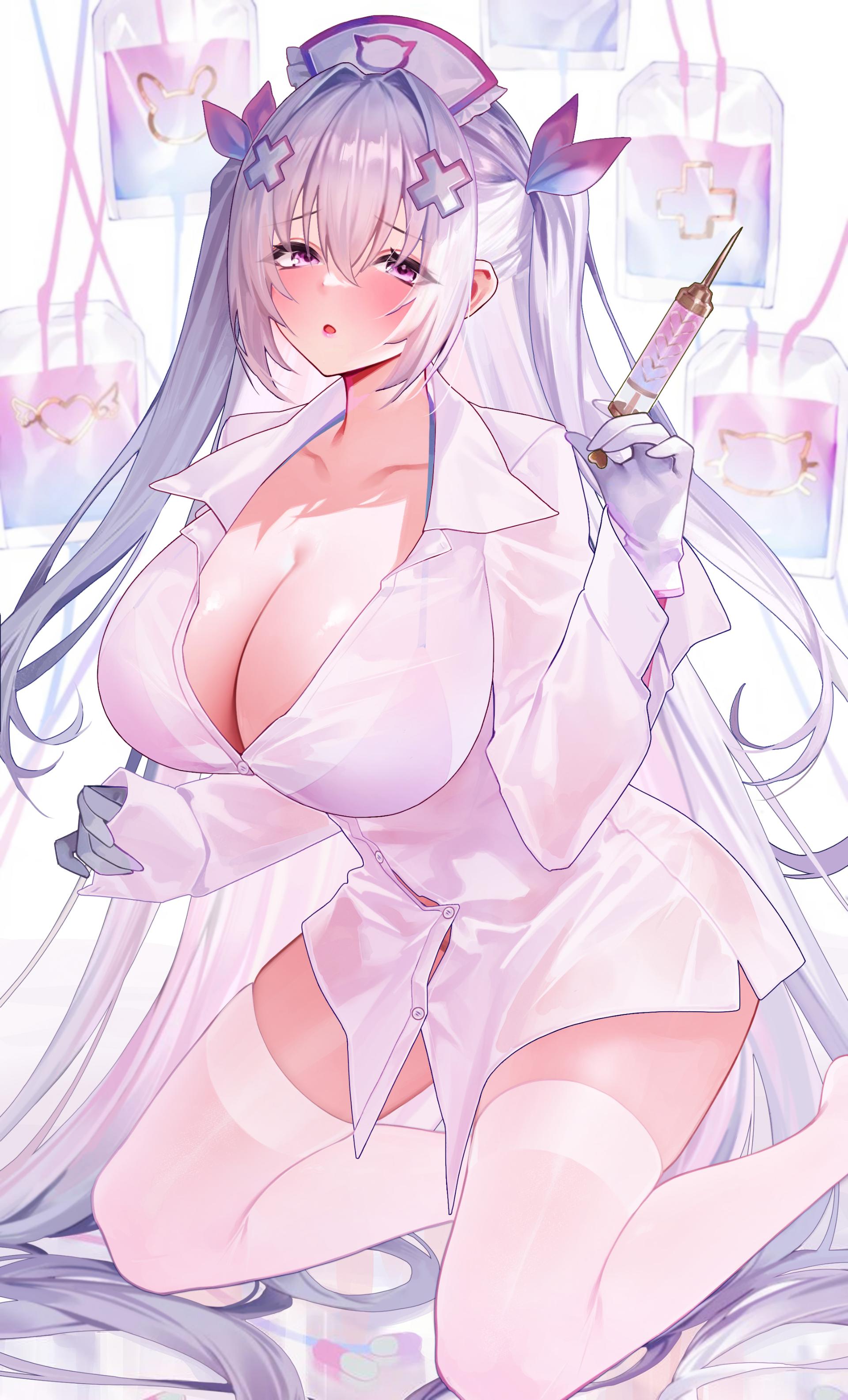 人物立绘同样SEX度封顶,突出一个又白又肉,双马尾萌妹银白色长发一直拖到地上,身着白色的护士装,戴着白色的护士帽+手套,手持针管似乎要给我们打针。(要不然还是我给你来一针吧,嘻嘻)胸前两个欧派极其的雄伟(跟头差不多大......),面色潮红,小嘴微涨,放佛要滴出水来。