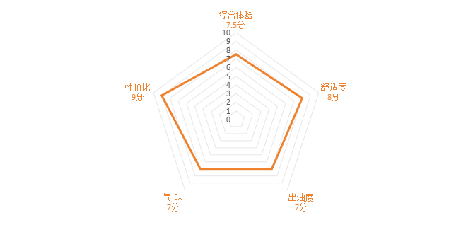 备注:雷达图越大产品评价越高,其中软硬度越高越软;出油度越高出油越少;气味越高异味越少。