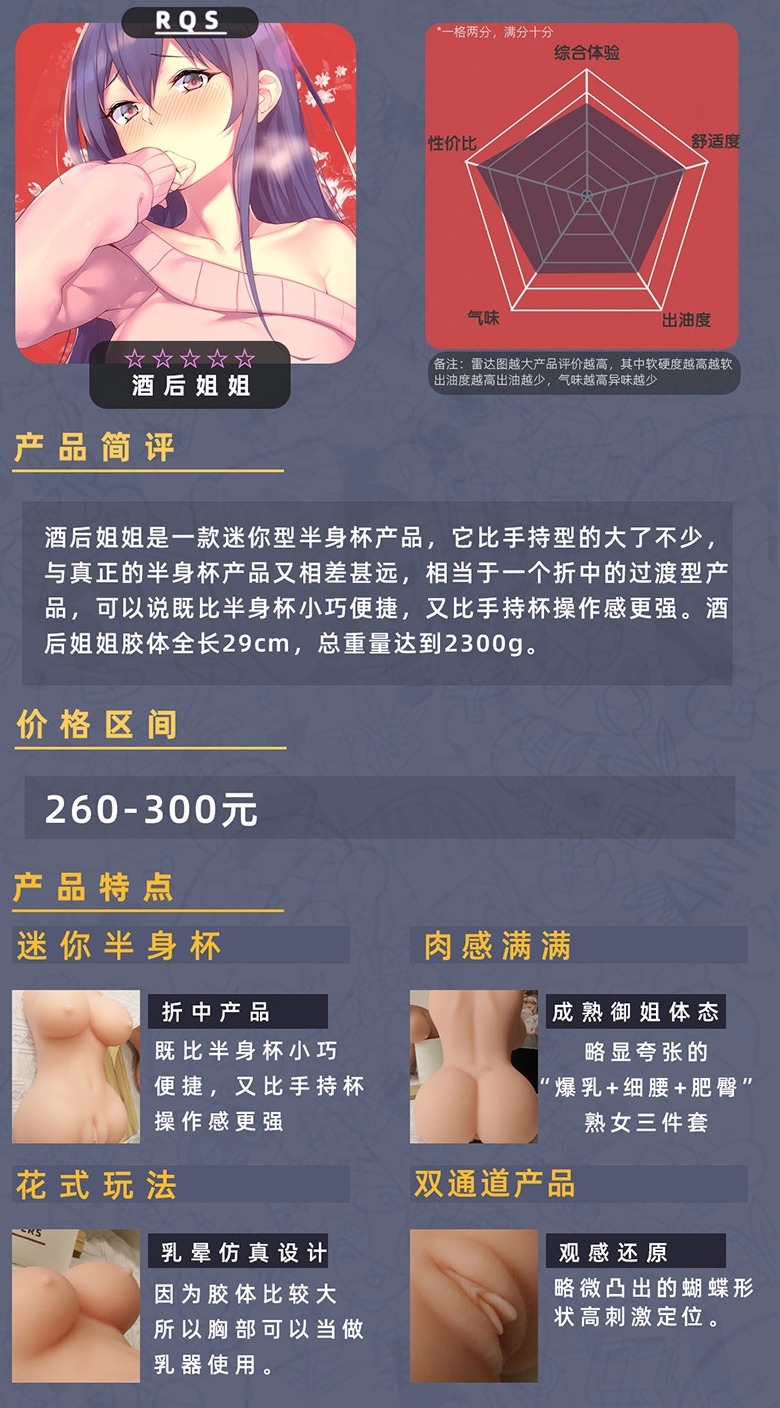 产品类型:迷你半身 价格:260-300元 刺激度:高 软硬度:中等