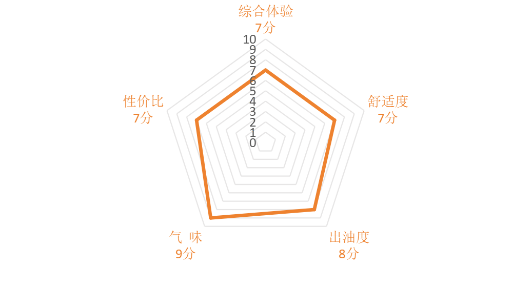 备注:雷达图越大产品评价越高,其中软硬度越高越软;出油度越高出油越少;气味越高异味越少。