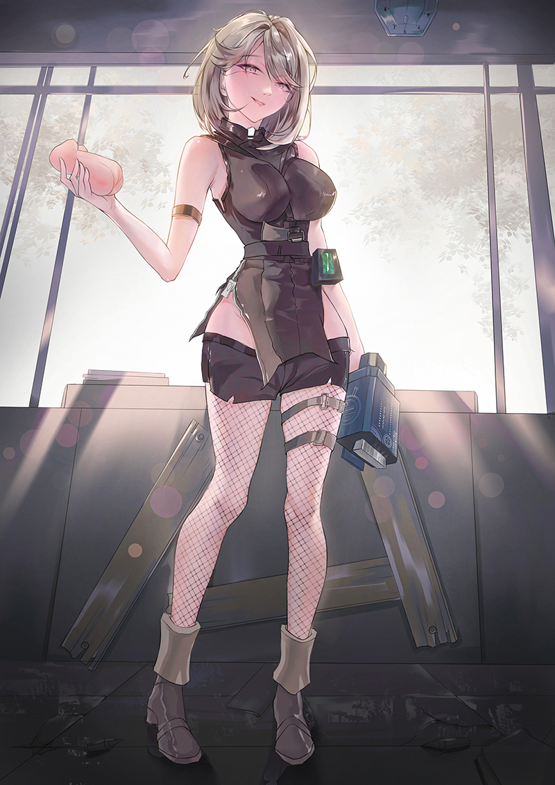 穿着网袜的御系大姐姐嘴角带笑,用一种戏谑的眼神俯视着我们,仿佛准备玩弄自己的猎物。紧身的黑色皮衣开高叉到腰间,同为黑色的短靴显得十分干练,高挑的身材被衬托得凹凸有致,大腿上还套有两个黑色皮带(紧缚爱好者已经eng了)。一手持枪(感觉更像望远镜......),一手掂量着一个名器(不出意外的话应该就是这款工口指挥官的胶体),好像要榨干我们(来吧,come!)。