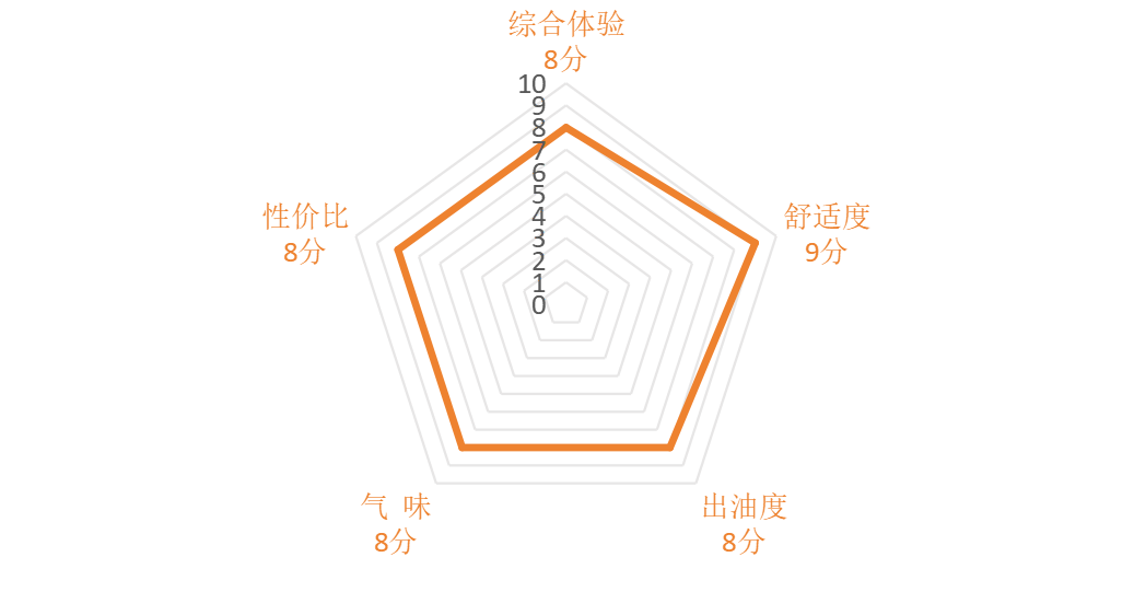 备注:雷达图越大产品评价越高,其中软硬度越高越软;出油度越高出油越少;气味越高异味越少。