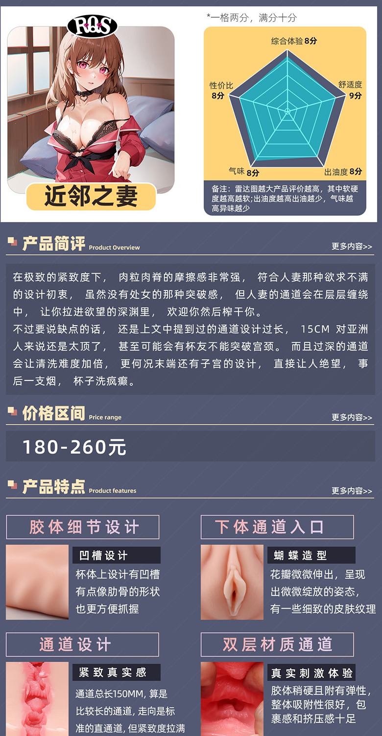 虽然单纯的直通道给人的物理刺激可能不是最高,但因为设计要素很多,而且通道非常紧小,在快速的冲刺下带来的快感还是很足的。只能说不愧是人妻,让人不禁感叹:“人妻好,人妻果然十个宝!”