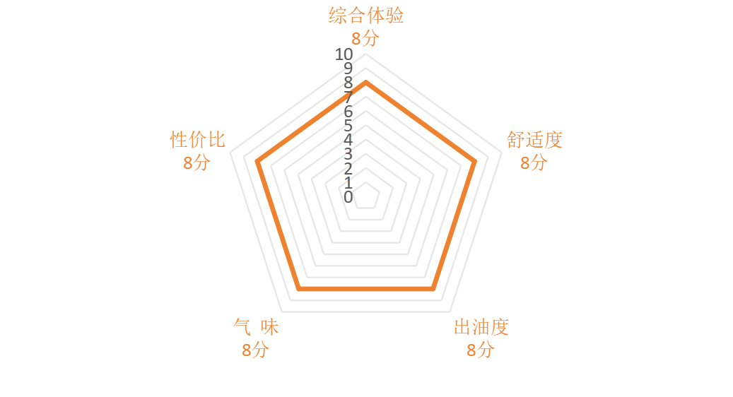 气味方面,产品控制中规中矩,20cm处能闻到淡淡的奶香味,10cm处的能闻到淡淡的橡胶味,贴鼻的话能闻到奶香和橡胶的混合味道。