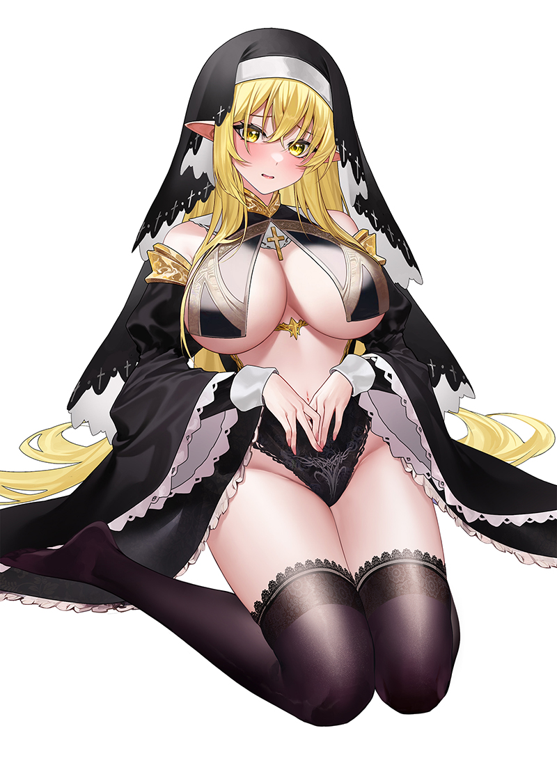 既然产品叫修女的侍奉,那人物立绘毫无疑问就是修女啦,而且看耳朵还是异世界精灵族的金发金眸修女,只不过这个修女肉感十足,而且衣着十分OPEN。