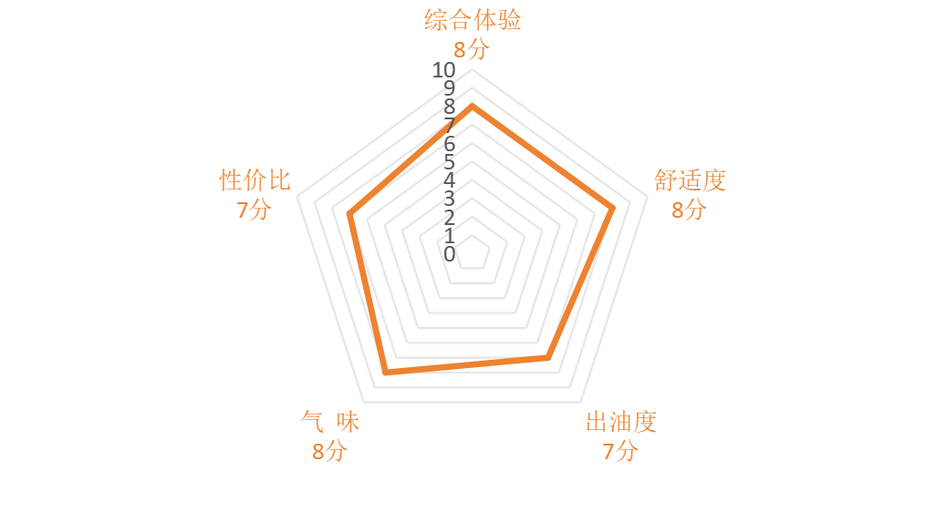 备注:雷达图越大产品评价越高,其中软硬度越高越软;出油度越高出油越少;气味越高异味越少。