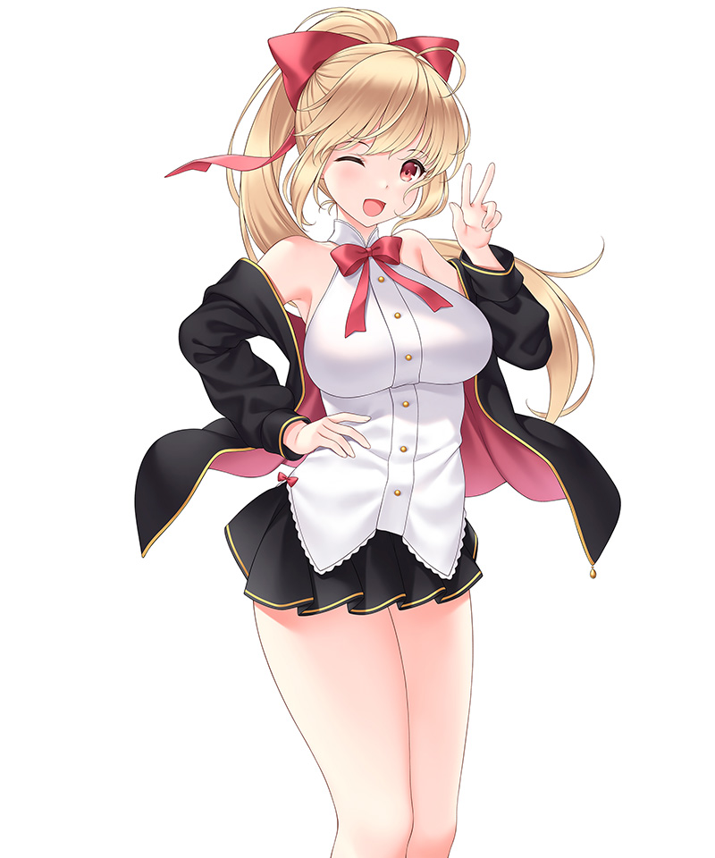 人物立绘是头戴红色大蝴蝶结的元气阳光美少女,黄色的高马尾搭配着路肩的短裙学生装,看起来很有元气。