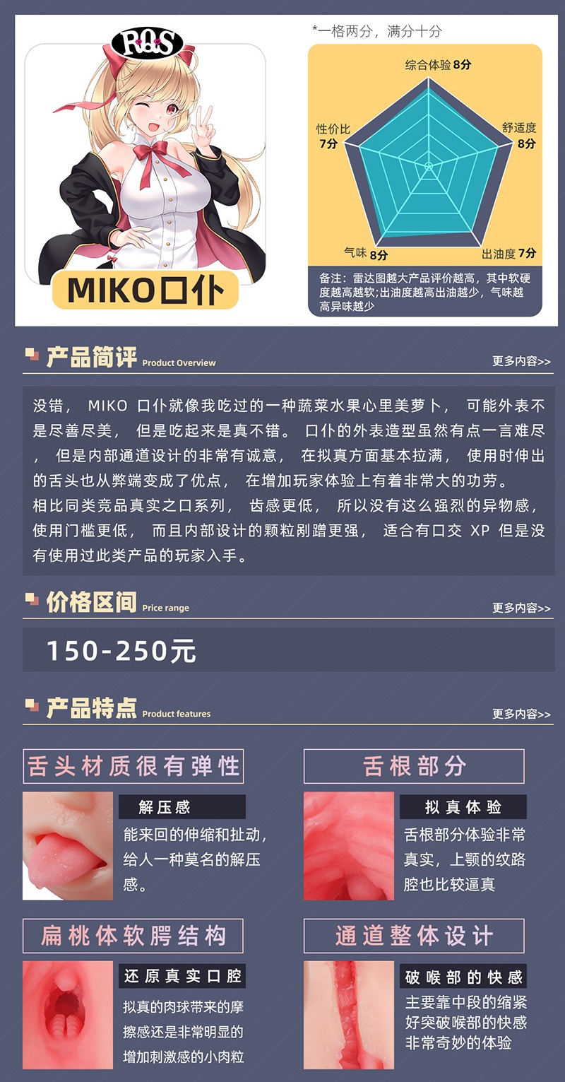 没错,MIKO口仆就像我吃过的一种蔬菜水果心里美萝卜,可能外表不是尽善尽美,但是吃起来是真不错。口仆的外表造型虽然有点一言难尽,但是内部通道设计的非常有诚意,在拟真方面基本拉满,使用时伸出的舌头也从弊端变成了优点,在增加玩家体验上有着非常大的功劳。