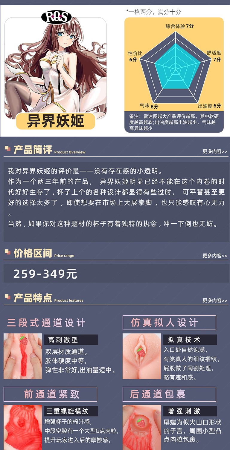 相比略显粗糙的外形,异界妖姬的内部通道再体验下来,就显得更值这个价。作为一款刺激杯来说,紧致度、剐蹭感都在各种小设计中体现的非常明显,对头部的包裹感也很到位,我愿意为此给出一个好评。
