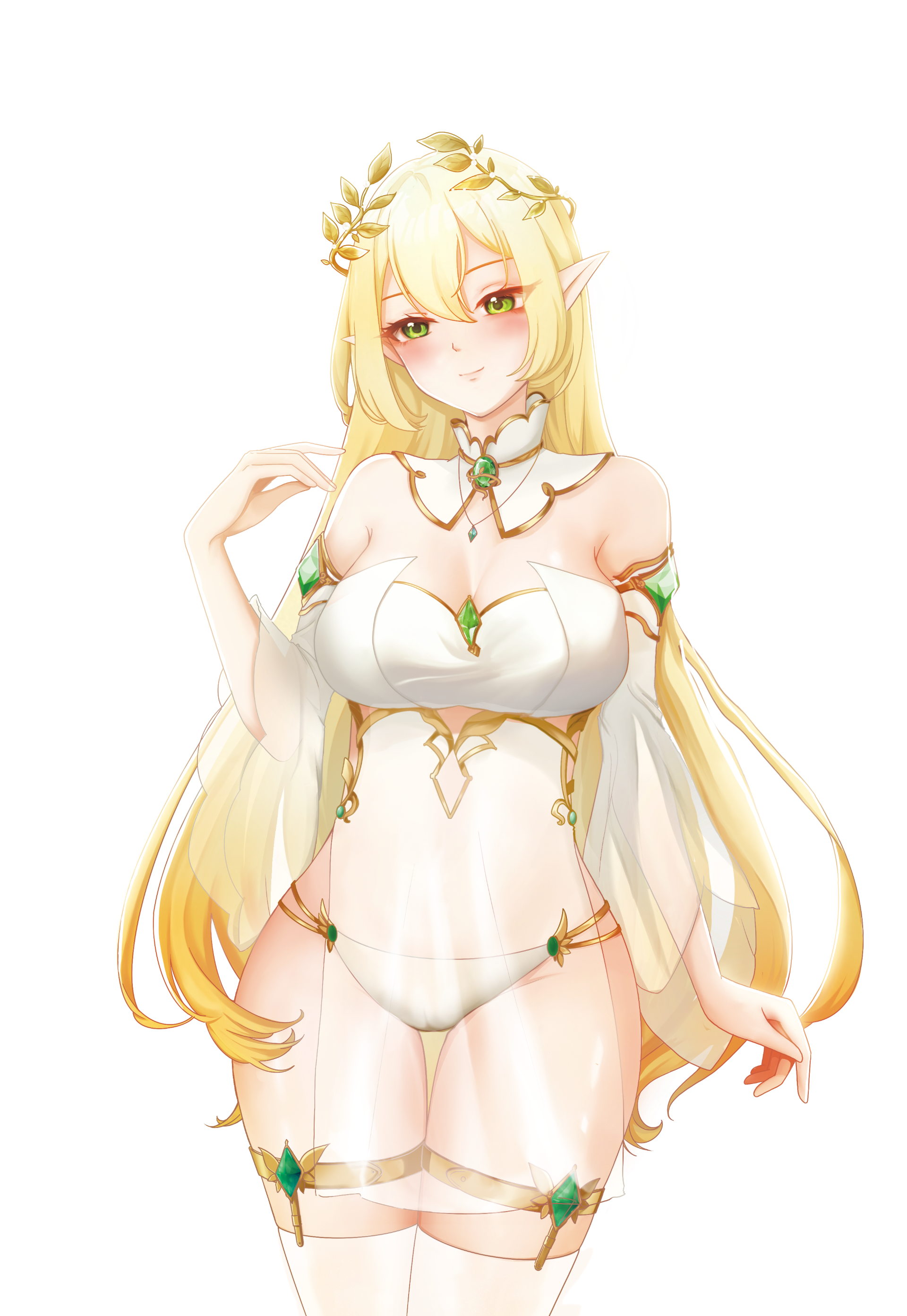 人物立绘的精致度相对他们家以前产品明显又上了一个层级,突出一个又圣洁又色情,背景似乎是在某处庭院或者花园,一位黄色及腰长发的尖耳精灵族御姐悄然而立,含情脉脉的看着你,她头戴橄榄枝,让人心生平和,但身上却仅着白色内衣模样的衣甲,寸寸白纱随风而动,这种露骨的诱惑又难免让人欲火中生。(好好好,我给10个满分)