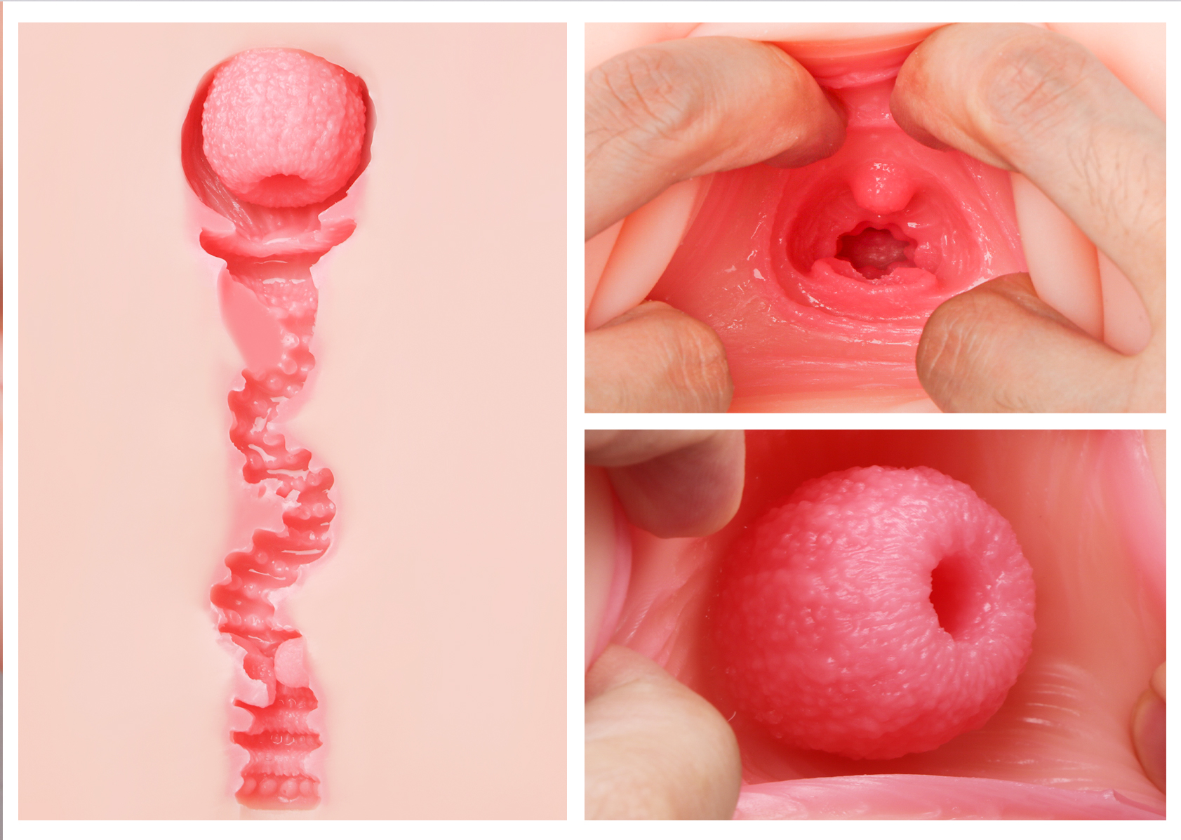使用时能明显感受到整个杯子无论什么元素都在为紧致度服务。首先,因为没有过多的设计,胶体的厚度和弹性非常可观,肉感很强;其次,环状颗粒和环状膜也是在局部缩小了通道的直径;最后的宫腔大肉粒在玩家进入后会进一步包裹住玩家,裹中裹,真的难顶。